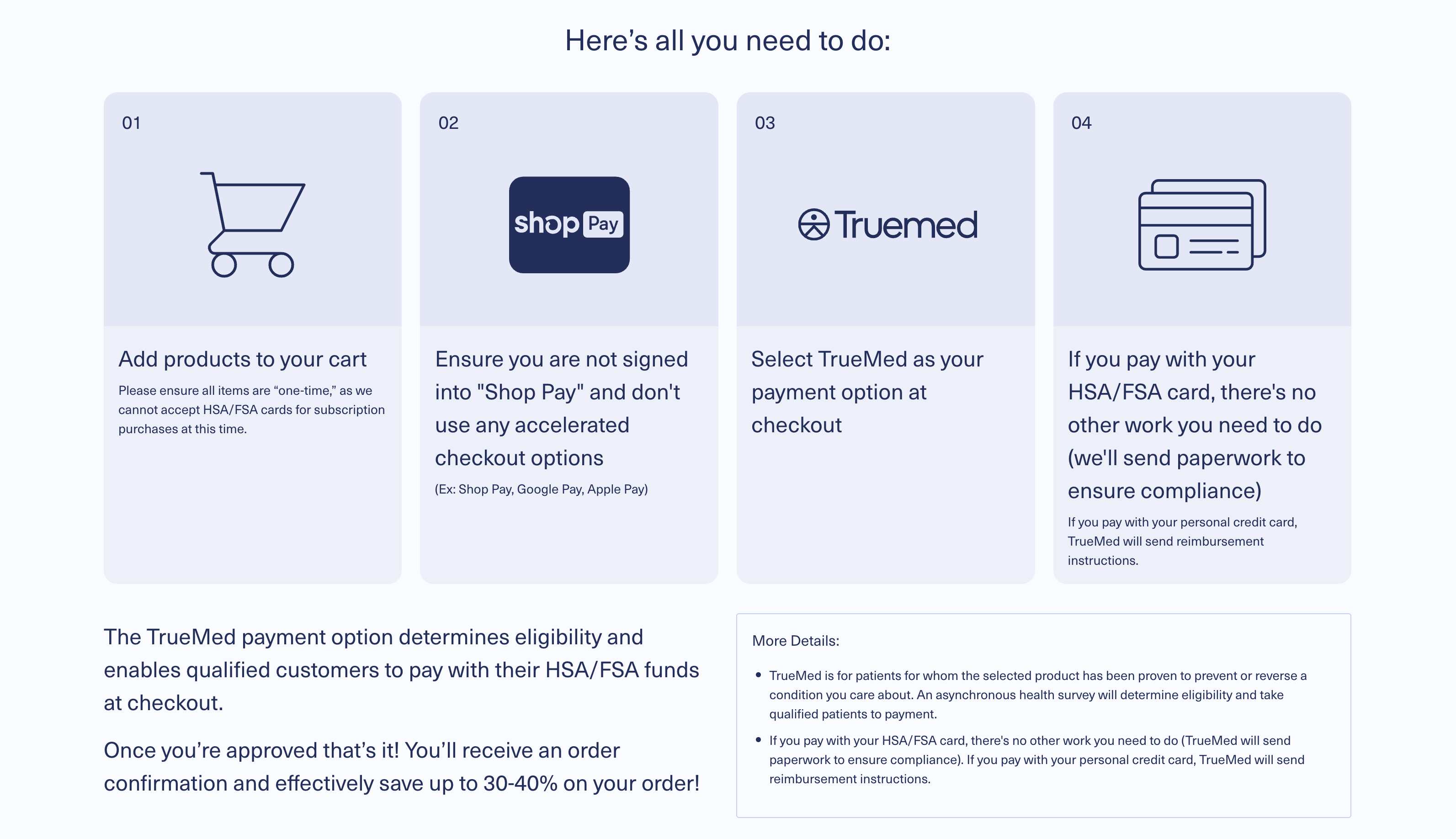 The Truemed payment option determines eligibility and enables qualified customers to pay with their HSA/FSA funds in checkout.